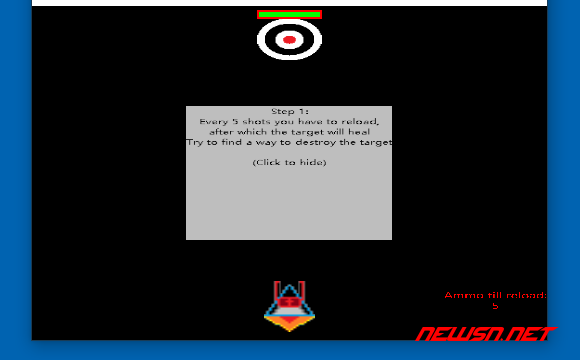 这个实战关卡里面,飞船只能旋转,不能移动。右侧有个子弹计数值,初始值为5。飞船和靶子的血量都是未知。子弹每五发,就需要更换弹夹。靶子就在这个时候恢复满血。因为靶子不会发射子弹,所以飞船的血量没有意义。