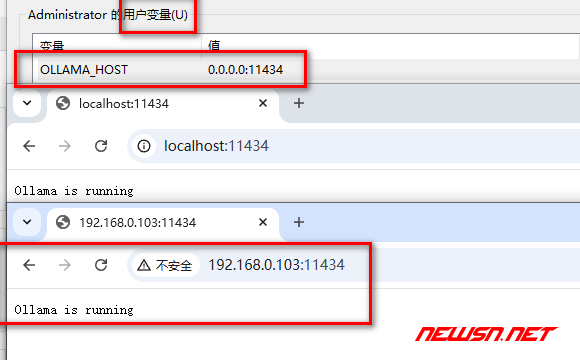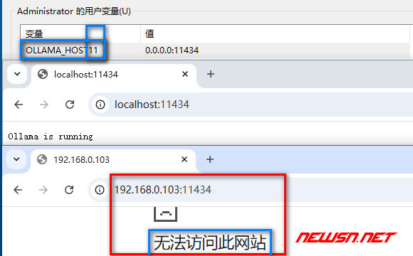 需要设置一个用户环境变量OLLAMA_HOST,为0.0.0.0:11434。(当然,也可以换个其它端口号)。