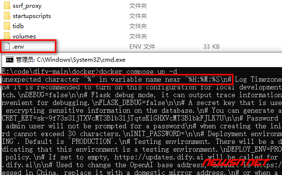 执行docker compose up -d的时候,提示.env文件出错。如下图所示: