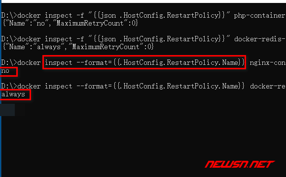 docker inspect -f "{{json .HostConfig.RestartPolicy}}" <your_container_name>docker inspect --format={{.HostConfig.RestartPolicy.Name}} <your_container_name>