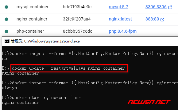 在创建好容器后,restart属性是可以再次修改的。可以使用下面的命令进行修改: