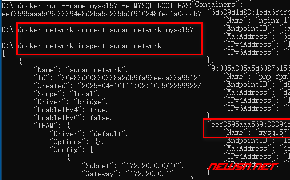 docker network connect sunan_network mysql57同样,可以使用以下命令将容器从网络中移除: