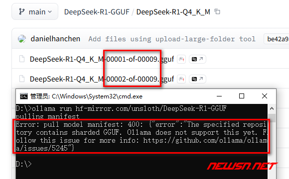 在huggingface网站上,存在着把一个大模型切分成多个小文件的情况。ollama明确表示,不支持这种“分享式”大模型。ollama明确表示并不支持这种为了便于分享而做分割处理的模型文件。参考下图: