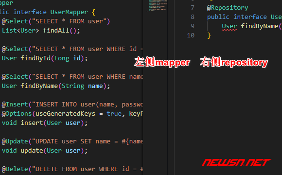 }【第二步】,mapper文件代替了repository文件。mapper文件选择了更简单的.java形式。src\main\java\com\example\demo\mapper\UserMapper.java: